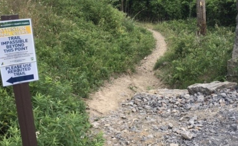 A volunteer work crew is needed to create a short reroute which will allow us to reopen a section of the Rachel Carson Trail in North Park. Across from the spillway, at the intersection of Babcock Boulevard and Pearce Mill Road, the trail goes down a short, steep hill beside the bridge abutment. To mitigate the erosion, the County has placed large rocks and smaller fill on the trail. Additionally, the county installed a reroute sign, which channels people around this section and onto an adjacent trail. Rachel Carson Trails Conservancy (RCTC) wants to maintain the existing route to preserve the unique quality of walking along the stream.